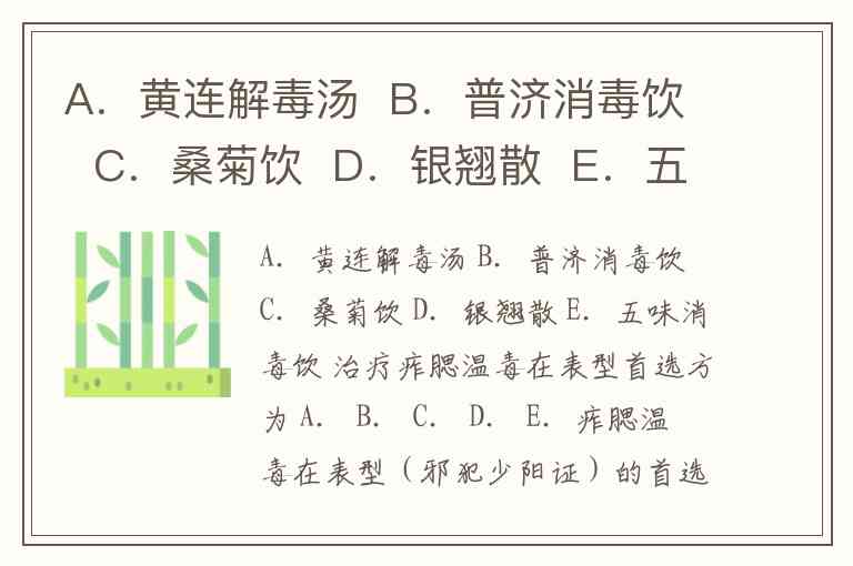 A.黄连解毒汤 B.普济消毒饮 C.桑菊饮 D.银翘散 E.五味消毒饮 治疗痄腮温毒在表型首选方为 A. B. C. D. E.