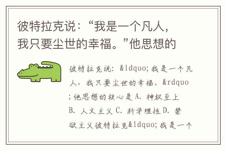彼特拉克说:“我是一个凡人,我只要尘世的幸福。”他思想的核心是 A. 神权至上 B. 人文主义 C. 科学理性 D. 禁欲主义
