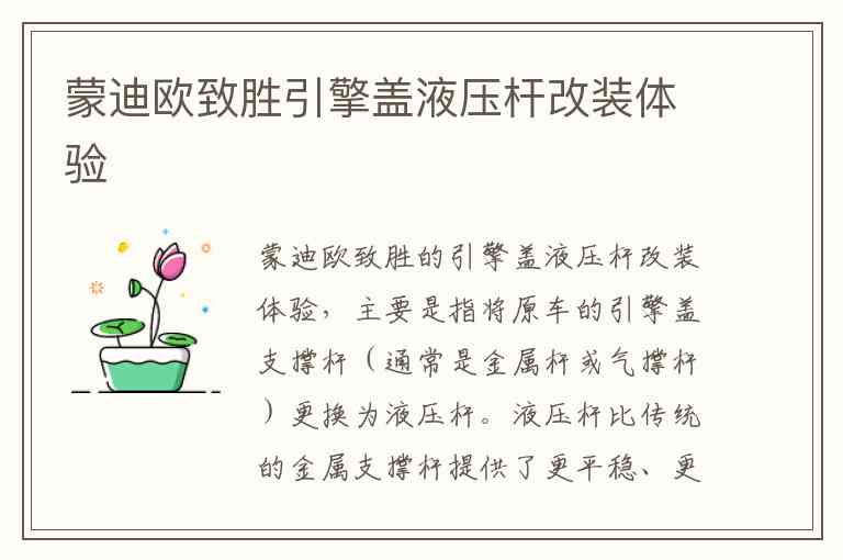 蒙迪欧致胜的引擎盖液压杆改装体验,主要是指将原车的引擎盖支撑杆(通常是金属杆或气撑杆)更换为液压杆。液压杆比传统的金属支撑杆提供了更平稳、更舒适的操作体验,也能更方便地打开和关闭引擎盖。