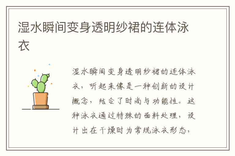 湿水瞬间变身透明纱裙的连体泳衣,听起来像是一种创新的设计概念,结合了时尚与功能性。这种泳衣通过特殊的面料处理,设计出在干燥时为常规泳衣形态,而当它接触到水时,材质的变化使它变得透明或半透明,呈现出类似纱裙的效果。这类设计一般都与现代泳装技术的创新密切相关,既富有美感,又增添了一种趣味性和神秘感。