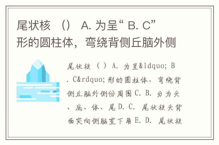尾状核 () A. 为呈“ B. C”形的圆柱体,弯绕背侧丘脑外侧份周围 C. B. 分为头、底、体、尾 D. C.尾状核头背面突向侧脑室下角 E. D.尾状核体沿着侧脑室的中央部走行 F. E.尾状核尾沿侧脑室后角的顶前行,末端与杏仁体相连。