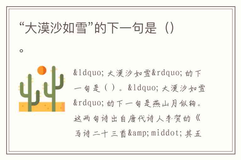 “大漠沙如雪”的下一句是燕山月似钩。这两句诗出自唐代诗人李贺的《马诗二十三首·其五》,通过“沙如雪”“月似钩”的比喻,描绘出边疆大漠在清冷月光下的苍茫景象,为后文抒发怀才不遇的感慨奠定了苍凉基调。全诗为:“大漠沙如雪,燕山月似钩。何当金络脑,快走踏清秋。”