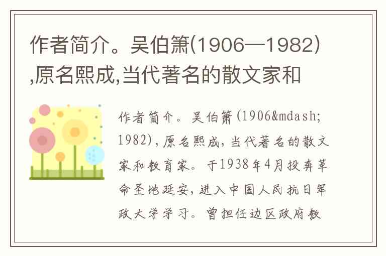 作为散文家,吴伯箫以《菜园小记》《记一辆纺车》等作品奠定地位,其文风质朴深沉,擅长从日常器物中提炼时代精神。这些创作集中于1940-1960年代,如《记一辆纺车》通过延安大生产运动中的纺车意象,展现自力更生的革命情怀。作为教育家,他1936年任莱阳乡村师范校长时就组织学生宣传抗日,1950年代参与全国中学语文教材编纂,毕生践行"舌耕笔耘"的双重使命。