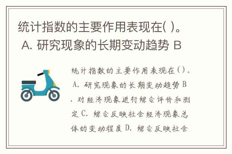 统计指数的主要作用表现在( )。 A. 研究现象的长期变动趋势 B. 对经济现象进行综合评价和测定 C. 综合反映社会经济现象总体的变动程度 D. 综合反映社会经济现象总体的变动方向 E. 分析经济发展变化中各种因素的影响方向和程度