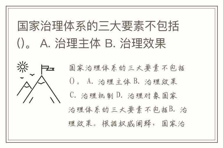 国家治理体系的三大要素不包括()。 A. 治理主体 B. 治理效果 C. 治理机制 D. 治理对象