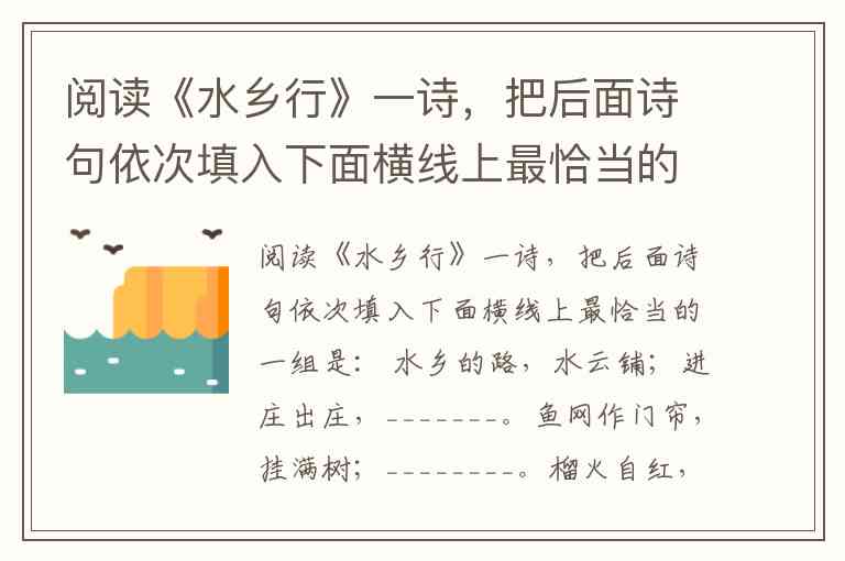 要解答《水乡行》诗句填充题,需结合诗歌意境、内容逻辑与水乡生活特征分析。全诗以“行”为线索,描绘水乡风光与生活场景,各横线处需与上下文在画面、动作及逻辑上衔接自然。