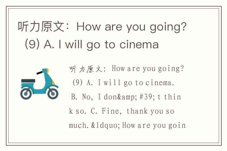 听力原文:How are you going? (9) A. I will go to cinema. B. No, I don't think so. C. Fine, thank you so much.