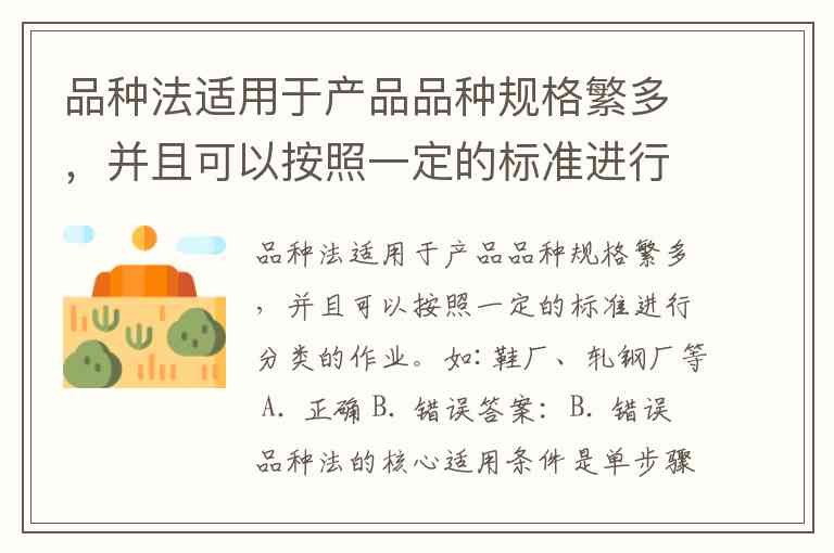 结论:品种法的本质是“简化单一品种或少数品种的成本核算”,而非应对多品种场景。题目混淆了品种法与分类法的适用边界,因此表述错误。企业选择成本计算方法时,需优先考虑生产步骤复杂性、产品多样性及管理需求,而非简单按“品种数量”判断。