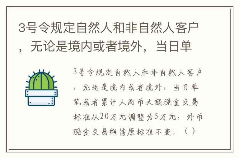3号令规定自然人和非自然人客户,无论是境内或者境外,当日单笔或者累计人民币大额现金交易标准从20万元调整为5万元,外币现金交易维持原标准不变。() A. 正确 B. 错误