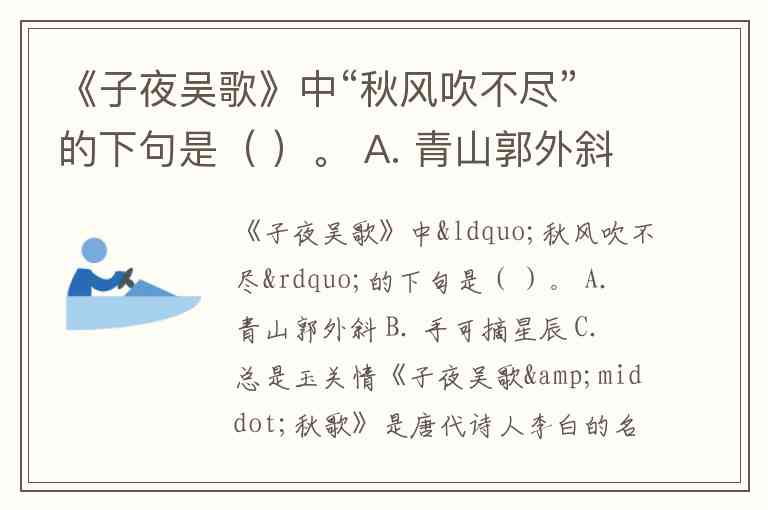 《子夜吴歌》中“秋风吹不尽”的下句是( )。 A. 青山郭外斜 B. 手可摘星辰 C. 总是玉关情