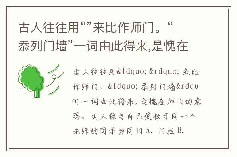古人往往用“”来比作师门。“忝列门墙”一词由此得来,是愧在师门的意思。古人称与自己受教于同一个老师的同学为同门 A. 门柱 B. 门栓 C. 墙门 D. 门墙