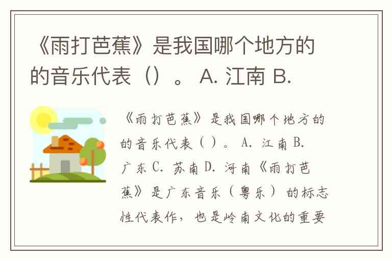 《雨打芭蕉》是我国哪个地方的的音乐代表()。 A. 江南 B. 广东 C. 苏南 D. 河南
