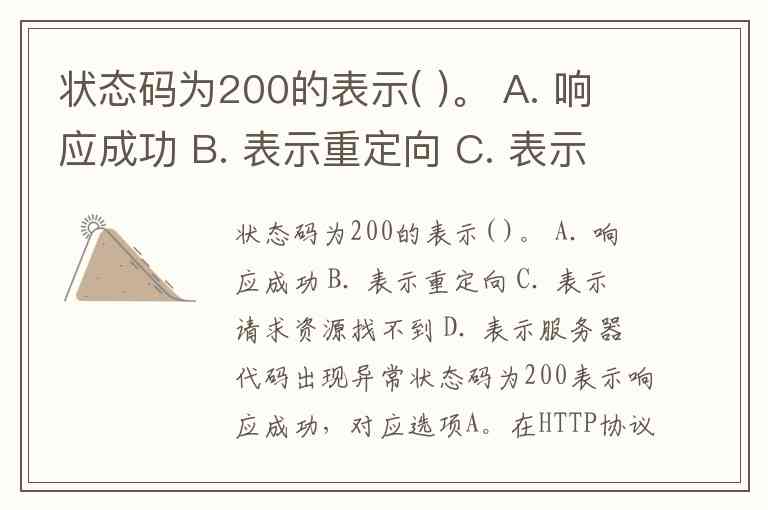 状态码为200的表示( )。 A. 响应成功 B. 表示重定向 C. 表示请求资源找不到 D. 表示服务器代码出现异常