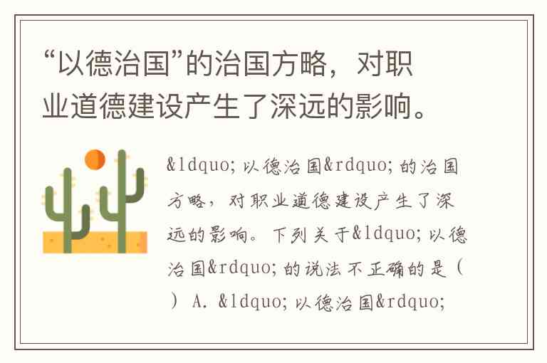 “以德治国”的治国方略,对职业道德建设产生了深远的影响。下列关于“以德治国”的说法不正确的是() A. “以德治国”坚持以“为人民服务”为核心和集体主义原则,是我们党对道德建设的一种新的科学的认识 B. “以德治国”就是要建立与社会主义社会发展相匹配的道德体系,使之成为公民普遍认同和自觉遵守的规范 C. “为政以德,譬如白辰,居其所而众星共之”是孟子关于“以德治国”思想的论述,儒家后来的承继者荀子也把“礼”和“刑”视为治国的基本手段,提出“隆礼”而“重法”,主张“德主刑辅”的治国之策 D. “以德治国”方略,可以说,与职业道德建设有着相互倚靠.相互促进的辨证关系——“以德治国”需要职业道德并能够促进职业道德建设,而职业道德本身是德治基础,职业道德建设则是贯彻“以德治国”方略的重要途径