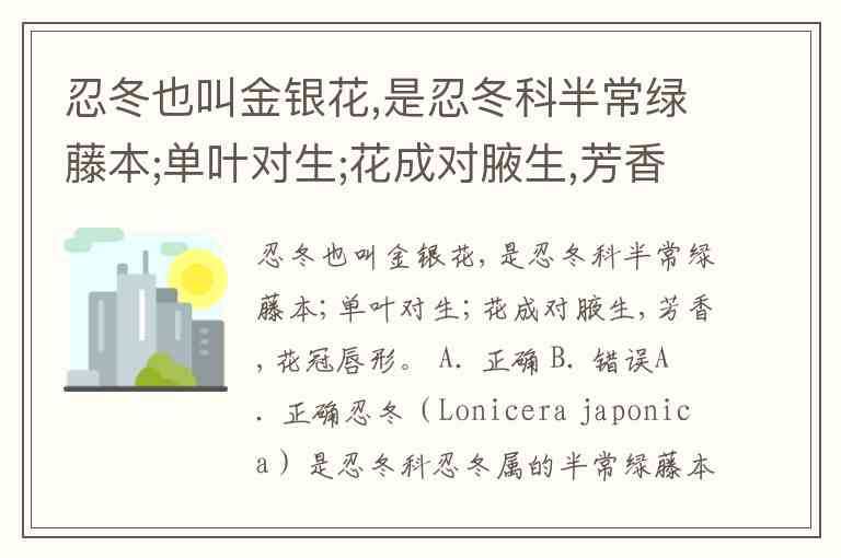 忍冬也叫金银花,是忍冬科半常绿藤本;单叶对生;花成对腋生,芳香,花冠唇形。 A. 正确 B. 错误