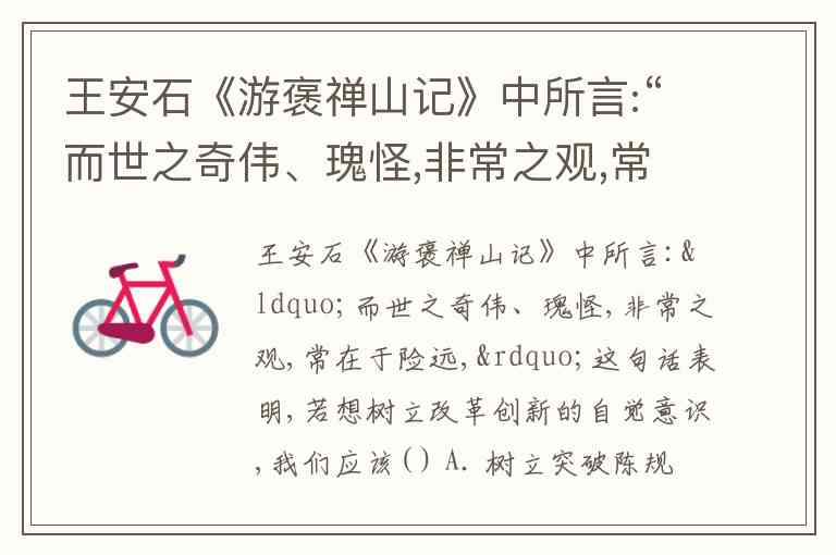 王安石《游褒禅山记》中所言:“而世之奇伟、瑰怪,非常之观,常在于险远,”这句话表明,若想树立改革创新的自觉意识,我们应该( ) A. 树立突破陈规陋习的自觉意识 B. 树立大胆探索未知领域的信心和勇气 C. 树立以创新创造为目标的走向 D. 增强改革创新的能力本领