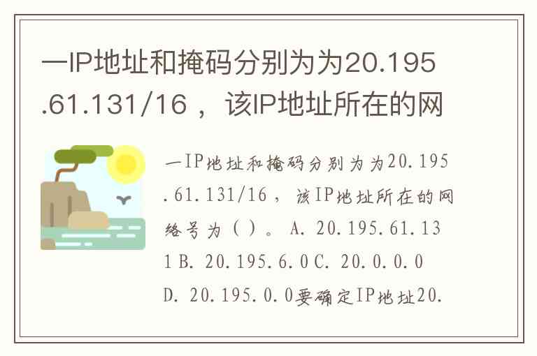 一IP地址和掩码分别为为20.195.61.131/16 ,该IP地址所在的网络号为()。 A. 20.195.61.131 B. 20.195.6.0 C. 20.0.0.0 D. 20.195.0.0