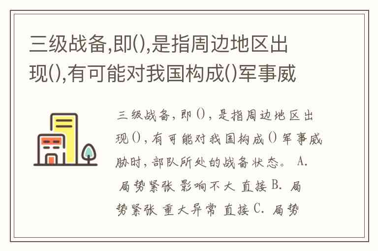 三级战备,即(),是指周边地区出现(),有可能对我国构成()军事威胁时,部队所处的战备状态。 A. 局势紧张 影响不大 直接 B. 局势紧张 重大异常 直接 C. 局势缓和 重大异常 间接 D. 局势缓和 影响不大 直接