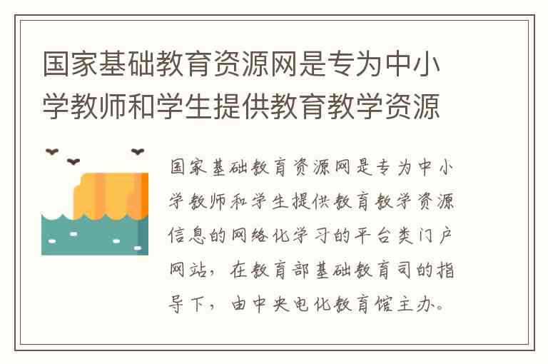 根据公开信息,"国家基础教育资源网"这一名称在机构改革和平台迭代后已发生变化。2021年事业单位改革中,原中央电化教育馆(教育部基础教育资源中心)与教育部教育装备研究与发展中心整合为教育部教育技术与资源发展中心(中央电化教育馆)。目前面向中小学师生的国家级教育资源平台实际为国家教育资源公共服务平台,该平台由教育部主办,教育部教育技术与资源发展中心(中央电化教育馆)具体维护,2012年12月28日正式开通,核心功能是通过"网络学习空间"实现优质资源精准推送,服务"优质资源班班通"和"网络学习空间人人通"建设。
