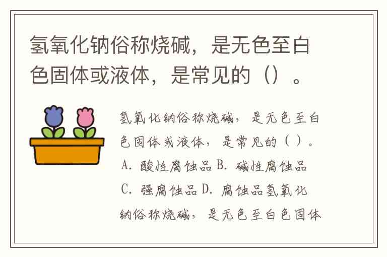 氢氧化钠俗称烧碱,是无色至白色固体或液体,是常见的()。 A. 酸性腐蚀品 B. 碱性腐蚀品 C. 强腐蚀品 D. 腐蚀品