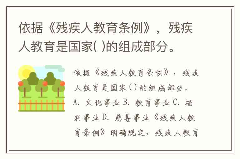依据《残疾人教育条例》,残疾人教育是国家( )的组成部分。 A. 文化事业 B. 教育事业 C. 福利事业 D. 慈善事业