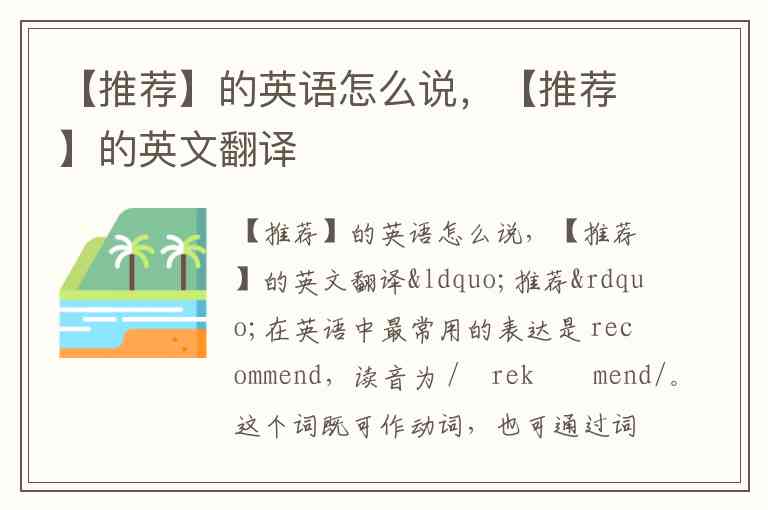 “推荐”在英语中最常用的表达是 recommend,读音为 /ˌrekəˈmend/。这个词既可作动词,也可通过词形变化(如 recommendation /ˌrekəmenˈdeɪʃn/)构成名词,表示“推荐的内容”或“推荐行为”。