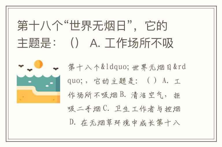第十八个“世界无烟日”,它的主题是:() A. 工作场所不吸烟 B. 清洁空气,拒吸二手烟 C. 卫生工作者与控烟 D. 在无烟草环境中成长