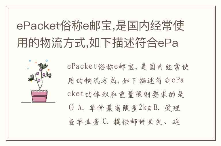 ePacket俗称e邮宝,是国内经常使用的物流方式,如下描述符合ePacket的体积和重量限制要求的是() A. 单件最高限重2kg B. 受理查单业务 C. 提供邮件丢失、延误赔偿 D. 最大尺寸:单件邮件长宽厚合计不超过90cm,最长一边不超过60cm E. 最小尺寸:单件邮件长度不小于14cm,宽度不小于11cm