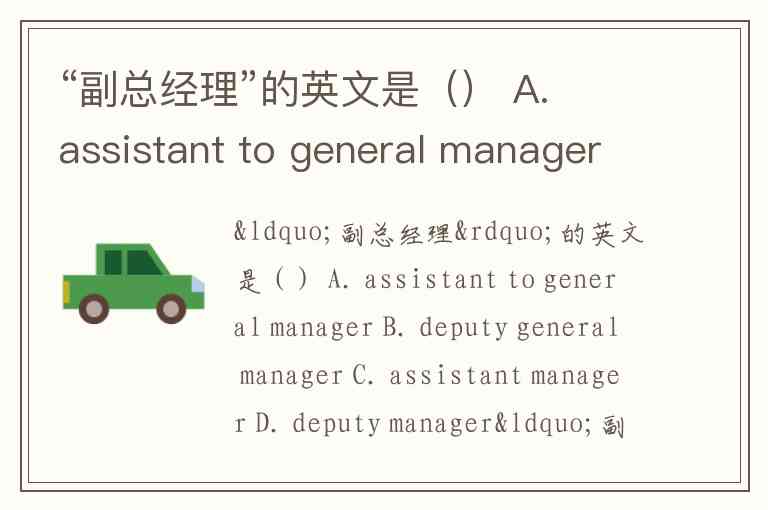 “副总经理”的英文是() A. assistant to general manager B. deputy general manager C. assistant manager D. deputy manager
