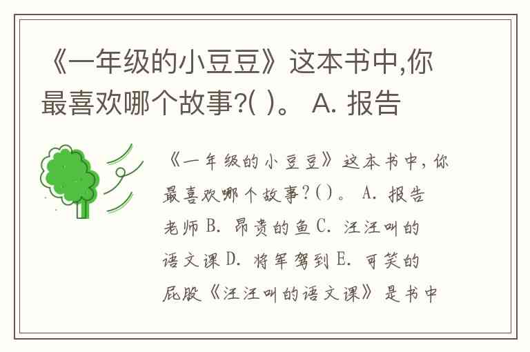 《一年级的小豆豆》这本书中,你最喜欢哪个故事?( )。 A. 报告老师 B. 昂贵的鱼 C. 汪汪叫的语文课 D. 将军驾到 E. 可笑的屁股