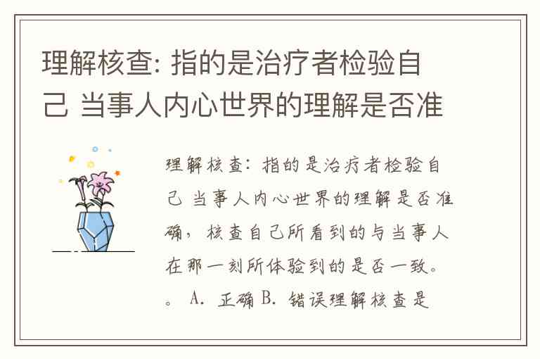 理解核查: 指的是治疗者检验自己 当事人内心世界的理解是否准确,核查自己所看到的与当事人在那一刻所体验到的是否一致。。 A. 正确 B. 错误