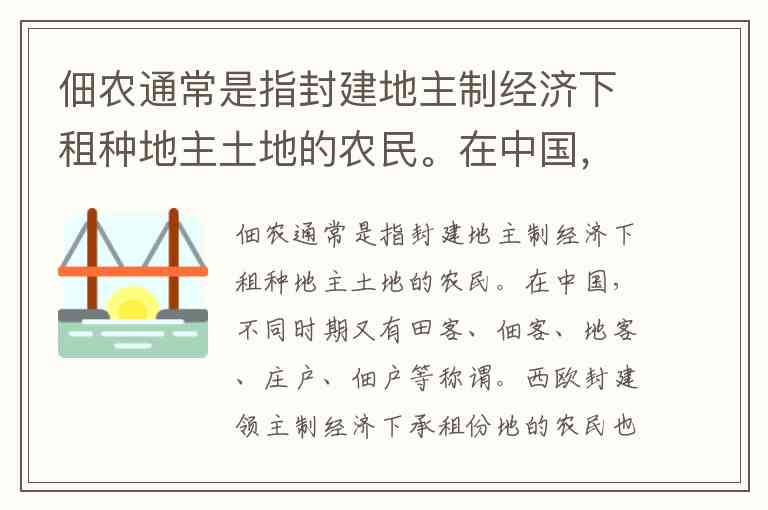 ③正确:佃农向地主缴纳地租(如劳役、实物或货币形式),这是封建社会地主剥削农民的典型且主要方式,地租本质上是农民剩余劳动的体现。