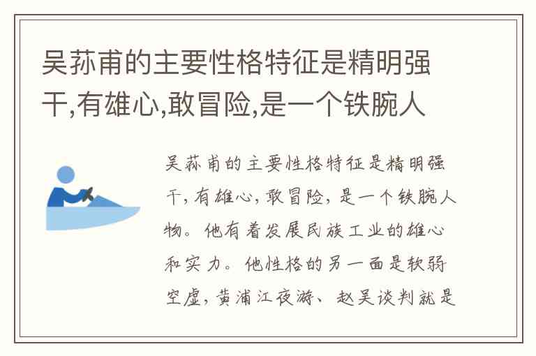 吴荪甫是茅盾《子夜》中塑造的民族资本家典型,其性格核心是矛盾的复合体:既有民族资本家的雄心与魄力,也有在时代夹缝中的挣扎与局限。题目前半部分对其“精明强干、有雄心、敢冒险、发展民族工业”的概括准确,他的确以铁腕手段整合实业,试图对抗外国资本与买办势力;但将其性格另一面定义为“软弱空虚”并以“黄浦江夜游、赵吴谈判”为例证,则存在偏差。