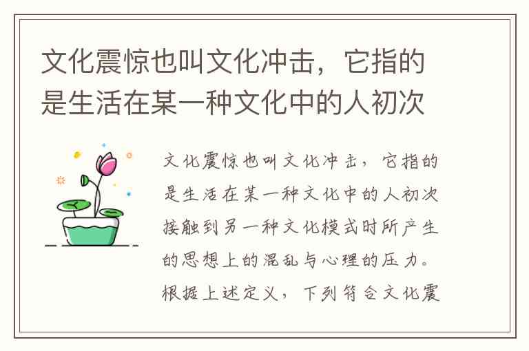 文化震惊的核心是首次接触差异显著的文化模式时产生的心理不适与认知混乱,需同时满足“跨文化环境”“初次接触”“系统性文化差异”三个条件。以下选项中,D符合这一定义:留学生因中外文化模式(如价值观、生活习惯、社会规则)的系统性差异,产生“格格不入”的思想混乱和“想念家乡”的心理压力,这与爱尔兰学者经历的饮食、社交方式冲击及奥博格定义的“对回家的渴望”高度吻合。