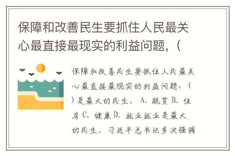 保障和改善民生要抓住人民最关心最直接最现实的利益问题,( )是最大的民生。 A. 脱贫 B. 住房 C. 健康 D. 就业