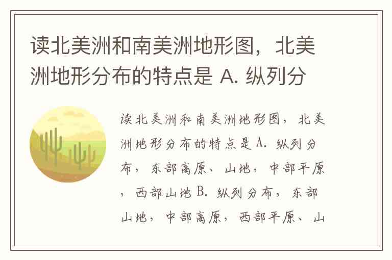 读北美洲和南美洲地形图,北美洲地形分布的特点是 A. 纵列分布,东部高原、山地,中部平原,西部山地 B. 纵列分布,东部山地,中部高原,西部平原、山地 C. 东部山地,北部平原,南部高原 D. 西部山地,北部平原,南部高原