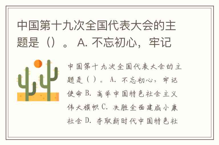 中国共产党第十九次全国代表大会的主题是不忘初心,牢记使命,高举中国特色社会主义伟大旗帜,决胜全面建成小康社会,夺取新时代中国特色社会主义伟大胜利,为实现中华民族伟大复兴的中国梦不懈奋斗。这一主题完整涵盖了大会的核心精神与奋斗目标,是新时代中国特色社会主义事业的行动纲领。