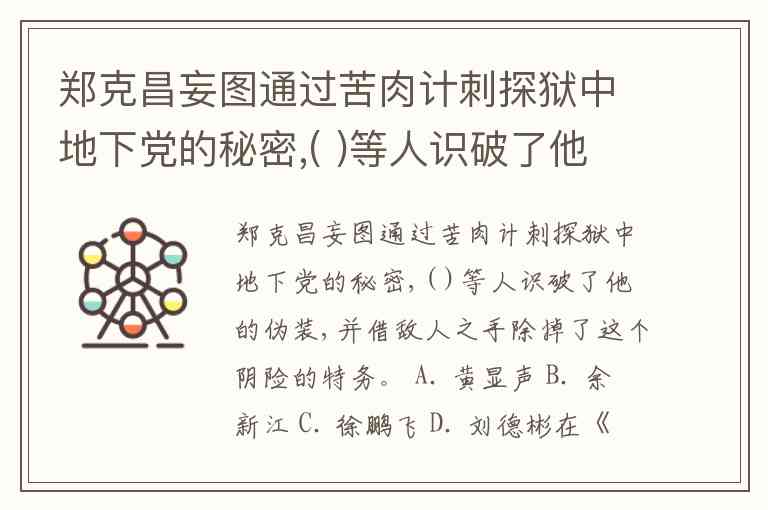 郑克昌妄图通过苦肉计刺探狱中地下党的秘密,( )等人识破了他的伪装,并借敌人之手除掉了这个阴险的特务。 A. 黄显声 B. 余新江 C. 徐鹏飞 D. 刘德彬
