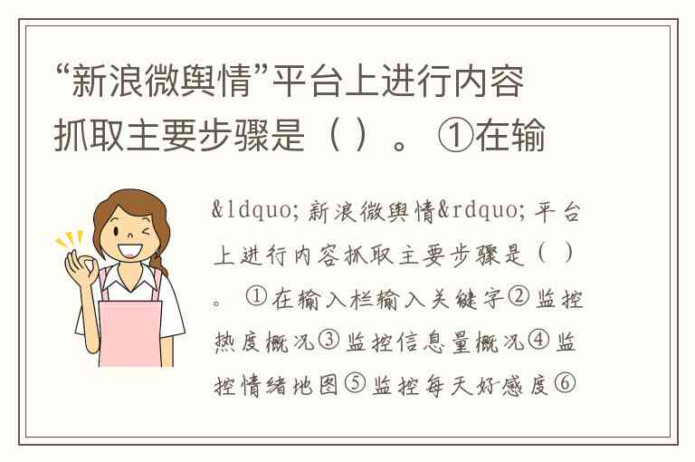 在新浪微舆情平台进行内容抓取,核心流程始于关键词设置,随后逐步展开多维度数据分析。根据操作指南,用户需先通过“添加方案”输入关键词(如“新浪舆情通+舆情监测”)完成基础配置,这对应题目中的①在输入栏输入关键字。完成配置后,系统自动生成包含热度趋势、信息总量等维度的“监测概述”,此即②监控热度概况和③监控信息量概况的环节。