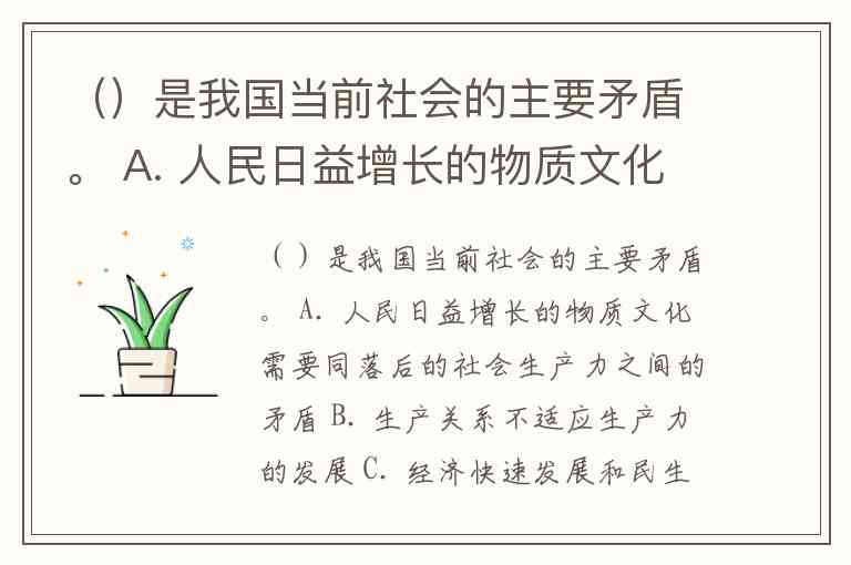 ()是我国当前社会的主要矛盾。 A. 人民日益增长的物质文化需要同落后的社会生产力之间的矛盾 B. 生产关系不适应生产力的发展 C. 经济快速发展和民生发展滞后之间的矛盾