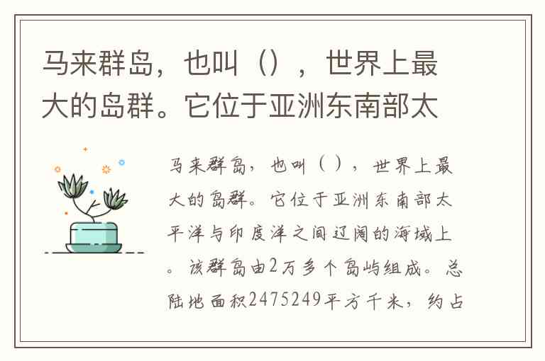 马来群岛,也叫(),世界上最大的岛群。它位于亚洲东南部太平洋与印度洋之间辽阔的海域上。该群岛由2万多个岛屿组成。总陆地面积2475249平方千米,约占世界岛屿面积的20%。沿赤道延伸6100千米,南-北最大宽度3500千米。 A. 南洋群岛 B. 托克劳群岛 C. 菲律宾群岛 D. 印度尼西亚群岛
