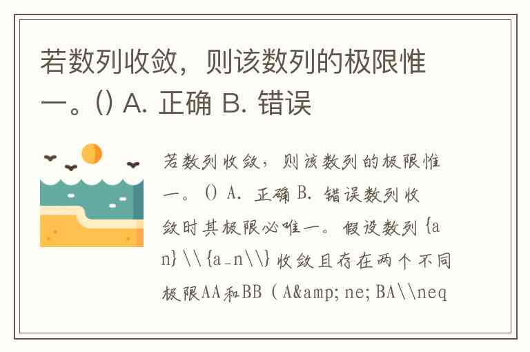 若数列收敛,则该数列的极限惟一。() A. 正确 B. 错误