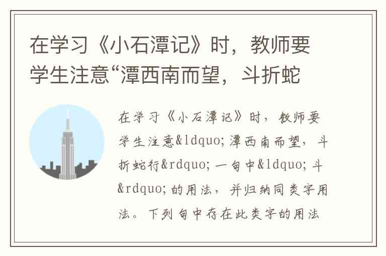 在学习《小石潭记》时,教师要学生注意“潭西南而望,斗折蛇行”一句中“斗”的用法,并归纳同类字用法。下列句中存在此类字的用法的一项是()。 A. 不耕而食,不蚕而衣 B. 天下云集响应,赢粮而景从 C. 殚其地之出,竭其庐之入 D. 隔篁竹,闻水声,心乐之