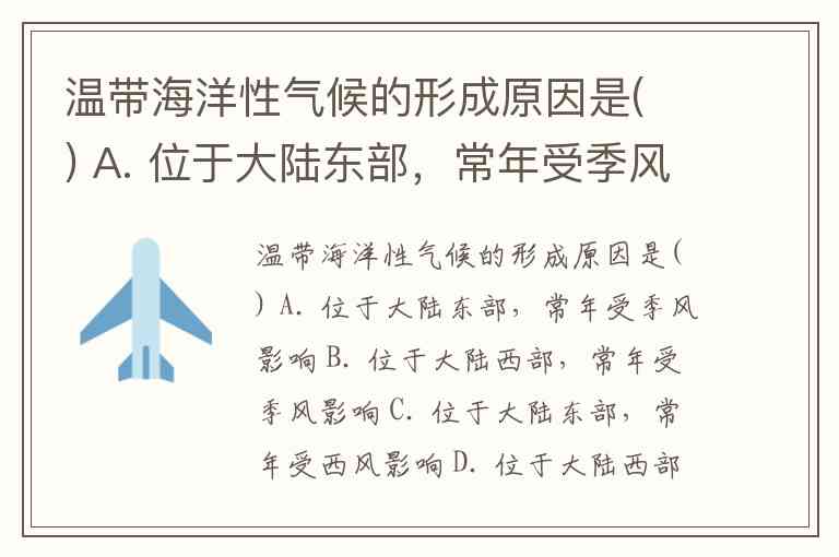温带海洋性气候的形成原因是( ) A. 位于大陆东部,常年受季风影响 B. 位于大陆西部,常年受季风影响 C. 位于大陆东部,常年受西风影响 D. 位于大陆西部,常年受西风影响