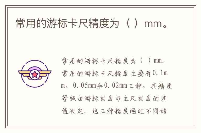 常用的游标卡尺精度主要有0.1mm、0.05mm和0.02mm三种,其精度等级由游标刻度与主尺刻度的差值决定。这三种精度通过不同的游标分度设计实现:0.1mm精度对应游标10等分(总长度9mm),0.05mm对应20等分(总长度19mm),0.02mm则为50等分(总长度49mm)。