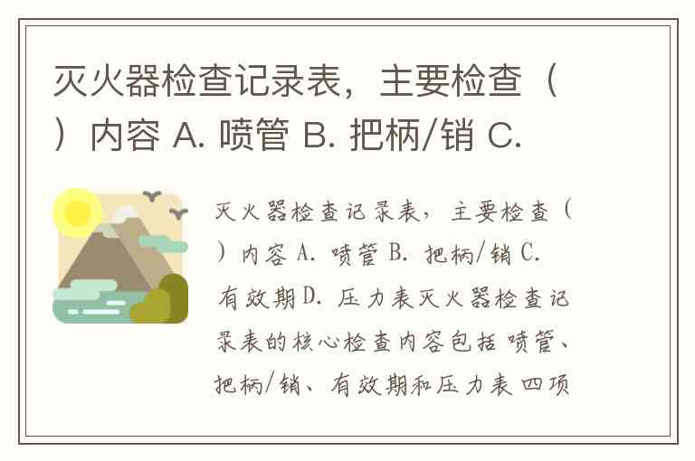 灭火器检查记录表,主要检查()内容 A. 喷管 B. 把柄/销 C. 有效期 D. 压力表