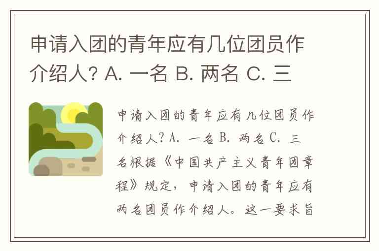 根据《中国共产主义青年团章程》规定,申请入团的青年应有两名团员作介绍人。这一要求旨在通过团员的推荐和培养,确保入团青年具备良好的思想政治素质和群众基础,同时也体现了团组织发展新成员的严谨性。介绍人需向团组织说明被介绍人的情况,并对其进行培养教育,帮助其符合团员标准。