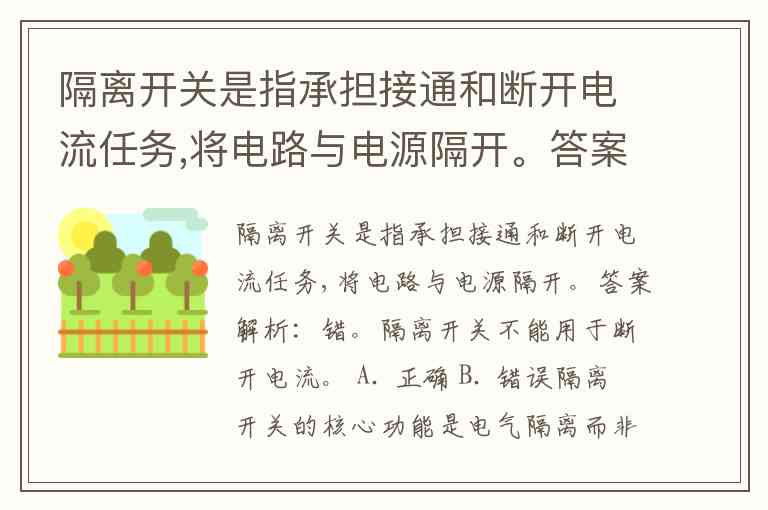 隔离开关是指承担接通和断开电流任务,将电路与电源隔开。答案解析:错。隔离开关不能用于断开电流。 A. 正确 B. 错误