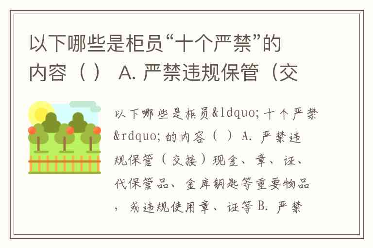 以下哪些是柜员“十个严禁”的内容( ) A. 严禁违规保管(交接)现金、章、证、代保管品、金库钥匙等重要物品,或违规使用章、证等 B. 严禁单人管理或单人进出现金、重空等库房 C. 严禁挪用尾箱中的现金、白条抵库,或未将款箱入库(或寄库)保管;或将非工作用包带入现金区 D. 严禁复制、共用、超权限持有或违规使用柜员卡、密码,或输入密码时不进行物理遮挡