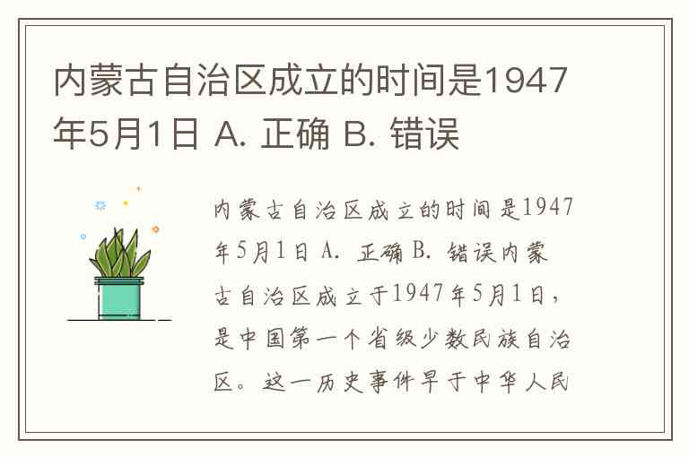 内蒙古自治区成立的时间是1947年5月1日 A. 正确 B. 错误